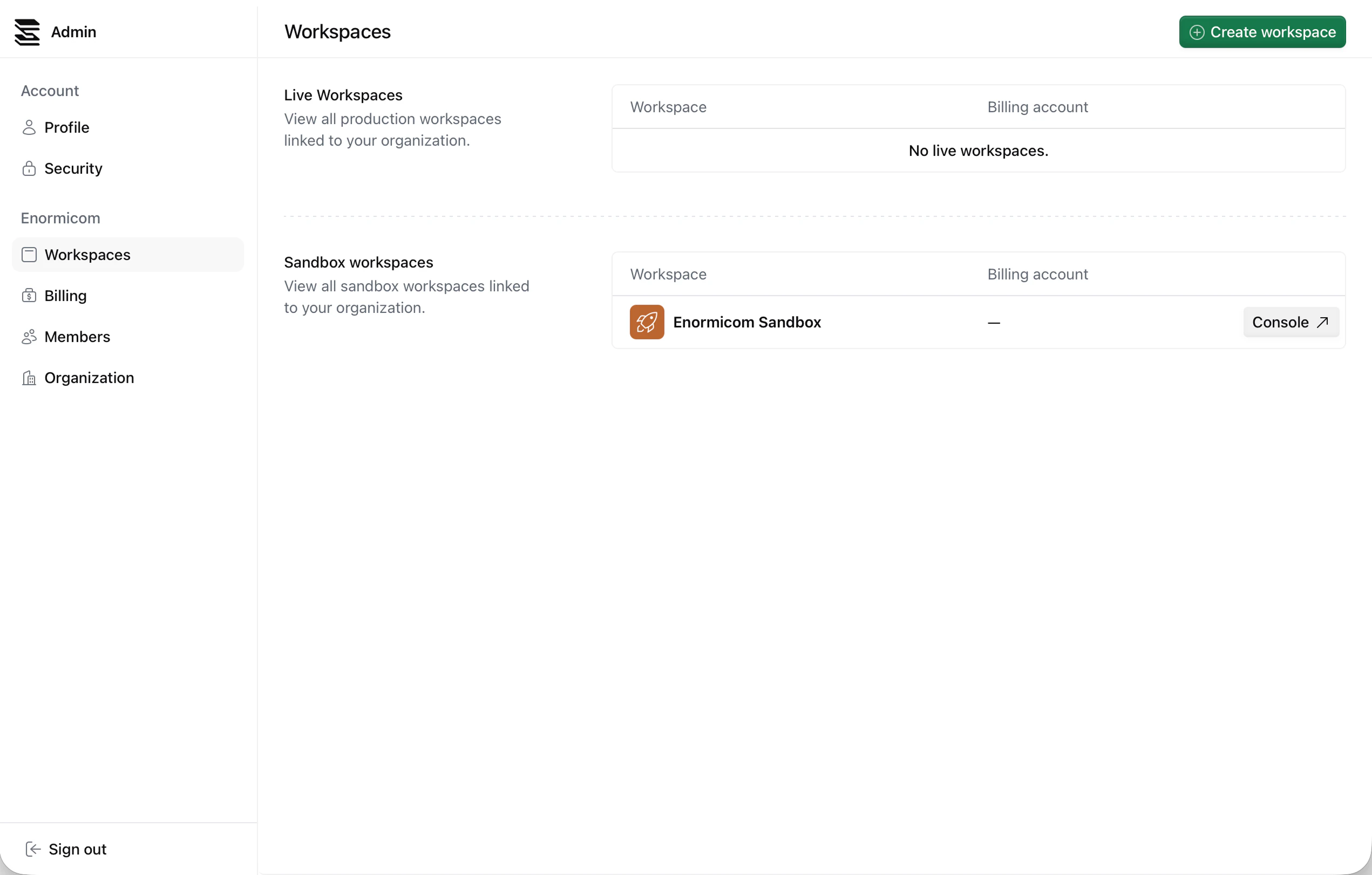 Enter a human-readable name for your workspace. This is often your company name or a descriptive label that identifies the workspace’s purpose e.g.,Enormicom ES-Live or Enormicom FR-Sandbox.