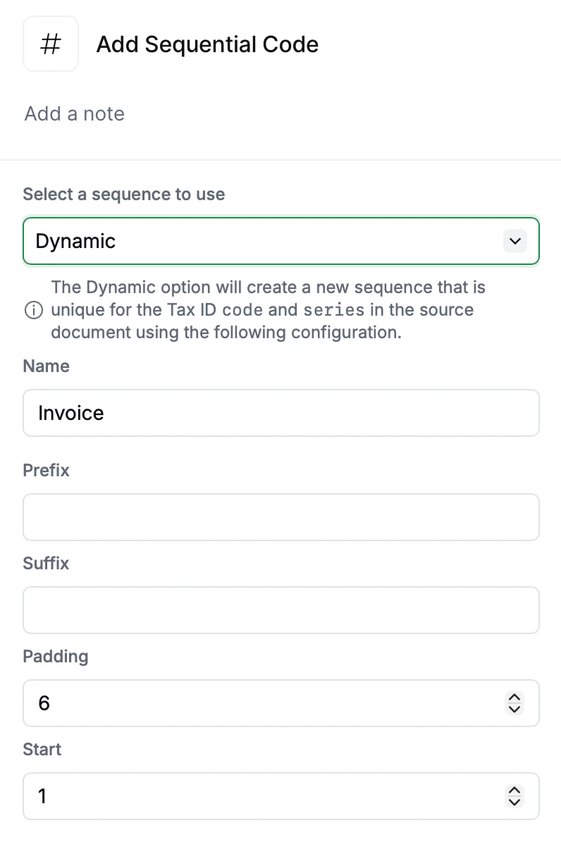 You will be able to use the series you’ve created from the API or through the “Add sequential code” step in your workflow. This will ensure your invoice numbers remain numbered correctly, as many regimes require not only unique invoice identifiers but also sequential numbering.