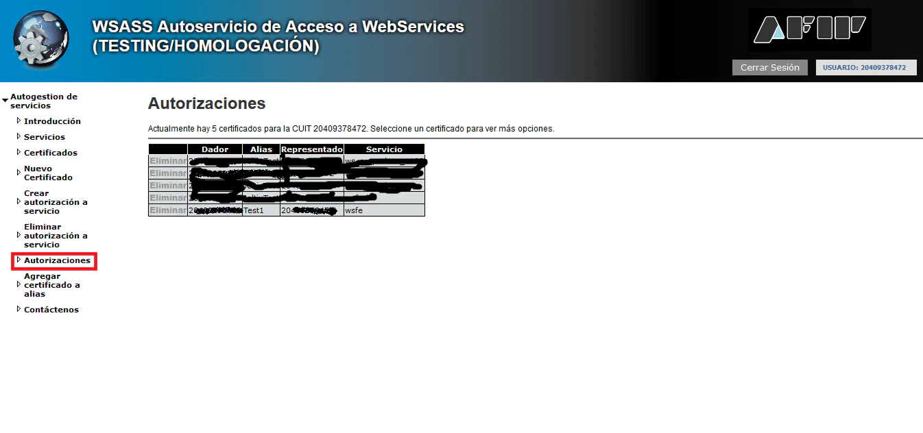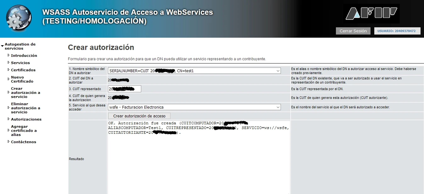 En 1. Nombre simbólico del DN a autorizar debemos seleccionar el certificado que queremos autorizar. En este caso usaremos el alias que hemos creado en el paso anterior.En 3. CUIT representado debemos ingresar el CUIT con el cual queremos utilizar el web service. En modo testing recomendamos usar el CUIT propio para no crear confusión.En 5. Servicio al que desea acceder debemos elegir wsfe (Web Service de Factura Electrónica).
