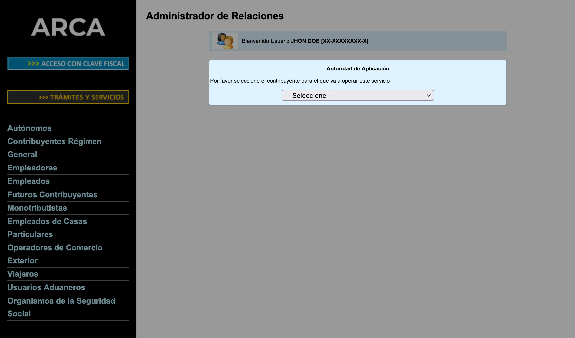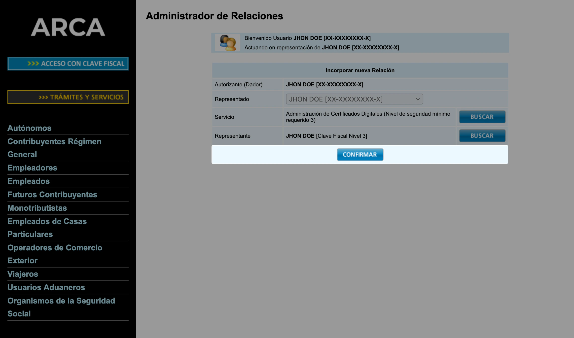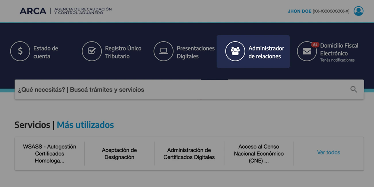 Desde el portal de ARCA, iniciar sesión y luego ingresar en Administrador de Relaciones de Clave Fiscal