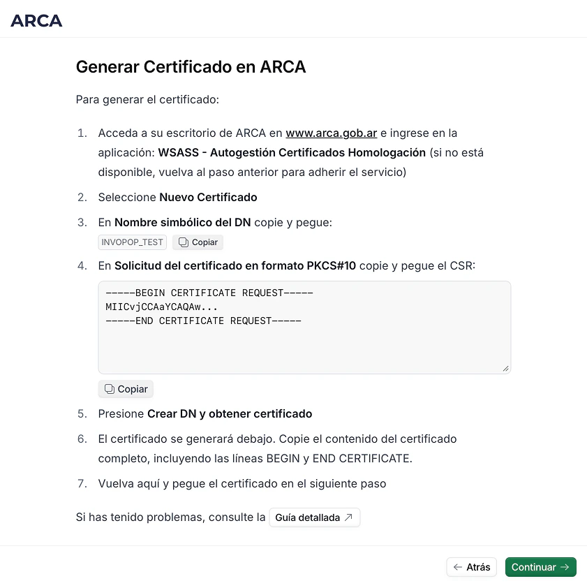 Un CSR es un bloque de texto codificado que le proporcionas a ARCA para solicitar un certificado SSL/TLS. Contiene información sobre tu organización y el dominio que deseas proteger.Copie el Alias y el CSR.