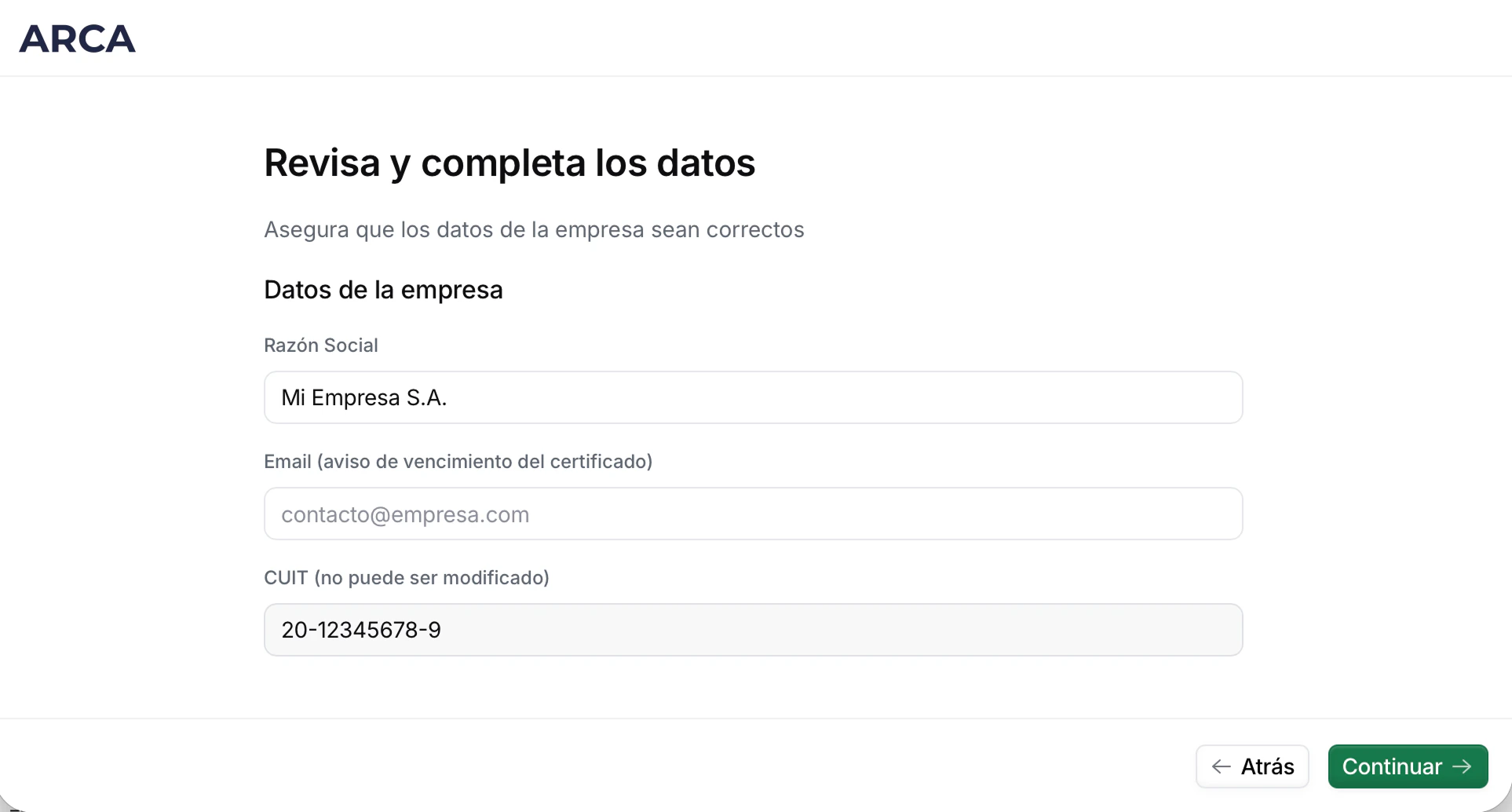 En el flujo de alta, verifica o corrige la información de la empresa: